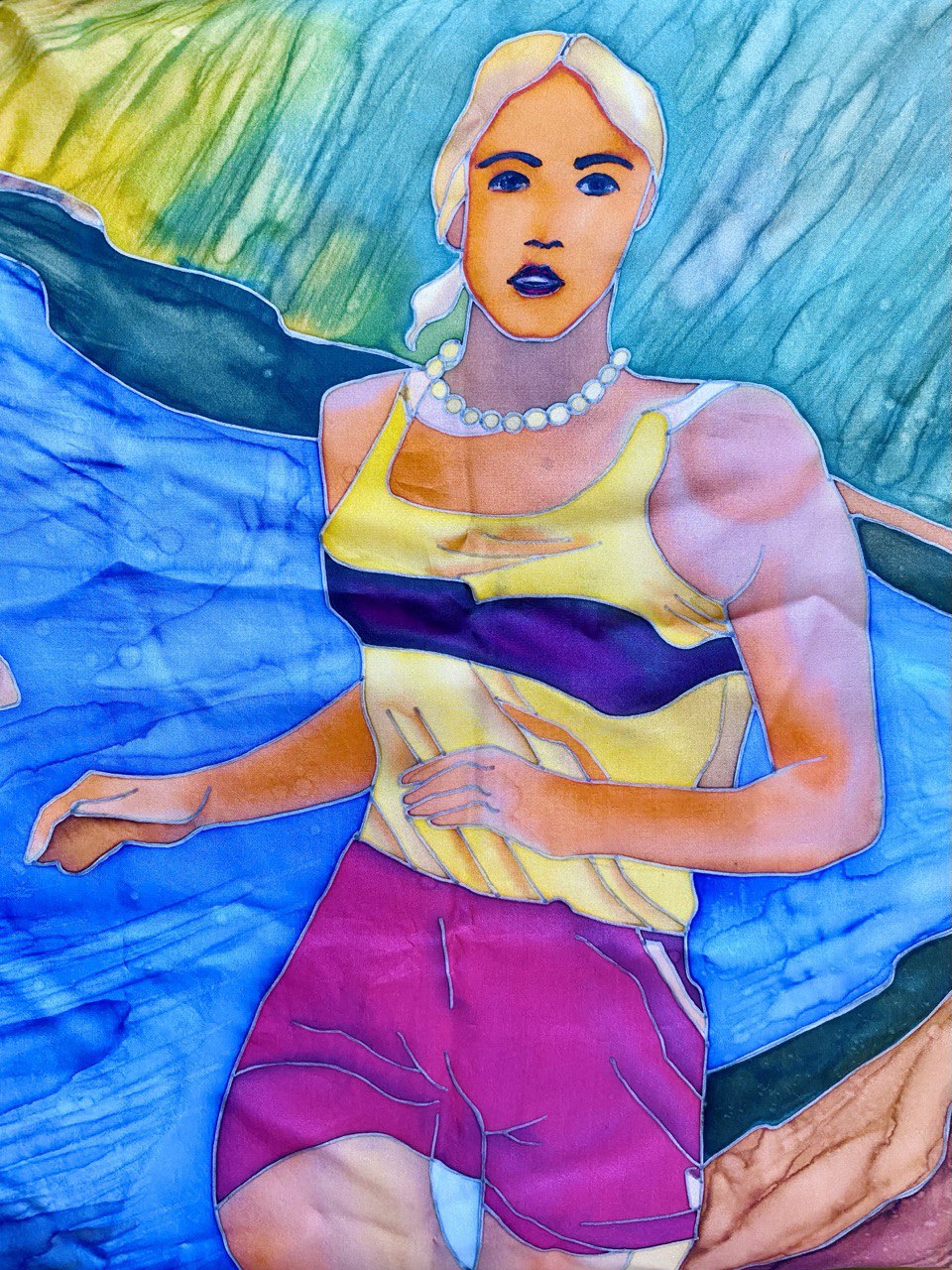 Мускулистые атлеты в технике батик словно скользят по гладкой ткани. Вот она, знаменитая динамика выдающегося советского художника, нашего земляка. В мае исполняется 125 лет со дня рождения Александра Дейнеки. Такие платки вполне могут стать стильным курским сувениром.