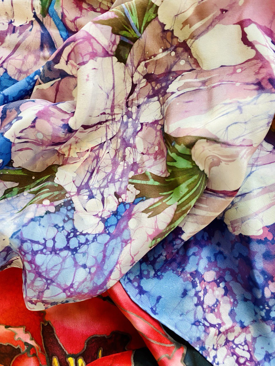 Помимо горячего и холодного батика Елена работает в технике «экопринт». Это окрашивание, к примеру, шёлка и кашемира настоями трав. Узоры мастер создаёт с помощью отпечатков листьев – эвкалипта, клёна, чистотела, папоротника. Необычное применение гербарию и оригинальный подарок.